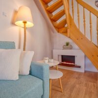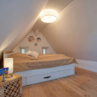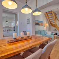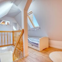 Das Schlafzimmer im Zwischengeschoß ist als klassisches Elternschlafzimmer eingerichtet. Ergänzt wird die Raumaufteilung durch eine separate Schlafecke mit kleinem Kinderbett. Diese Fläche kann je nach Bedarf auch als zusätzlicher Rückzugsort, Arbeitsbereich oder praktische Ergänzung für Ferienaufenthalte genutzt werden. Der Essbereich bietet Platz für bis zu vier Personen und macht die Wohnung auch für Familien oder Gäste alltagstauglich.