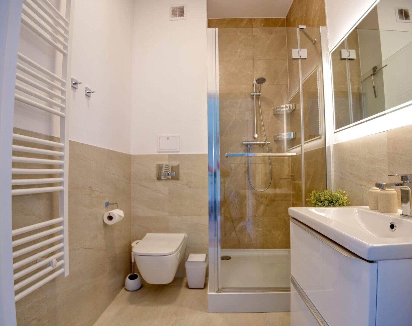Die Wohnfläche beträgt 45,30 m². Dabei ist zu beachten, dass die Flächenberechnung nach polnischer Norm erfolgt. Gerade bei Wohnungen mit Dachschrägen ist das relevant, weil bestimmte Flächen nicht in voller Höhe angerechnet werden. In der Praxis wirkt die Wohnung daher oft großzügiger, als es die reine Quadratmeterzahl zunächst vermuten lässt.