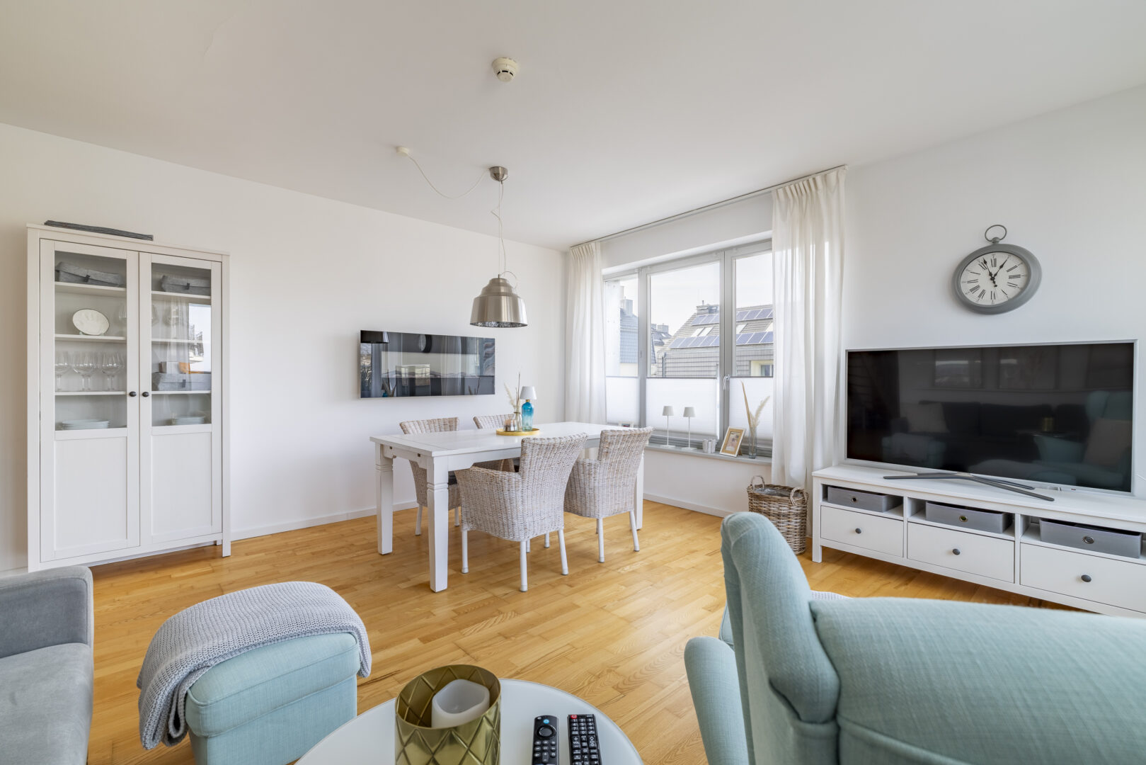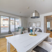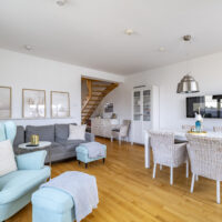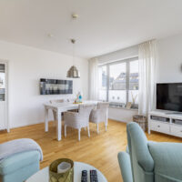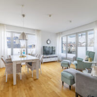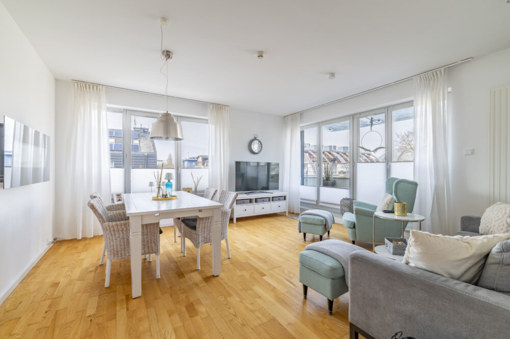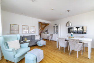 Der großzügige Wohn- und Essbereich ist lichtdurchflutet. Große Fensterfronten öffnen den Raum und führen direkt auf einen der Balkone. Helle Parkettböden, stilvolle Einrichtung und eine harmonische Farbwelt erzeugen eine entspannte Küstenatmosphäre.