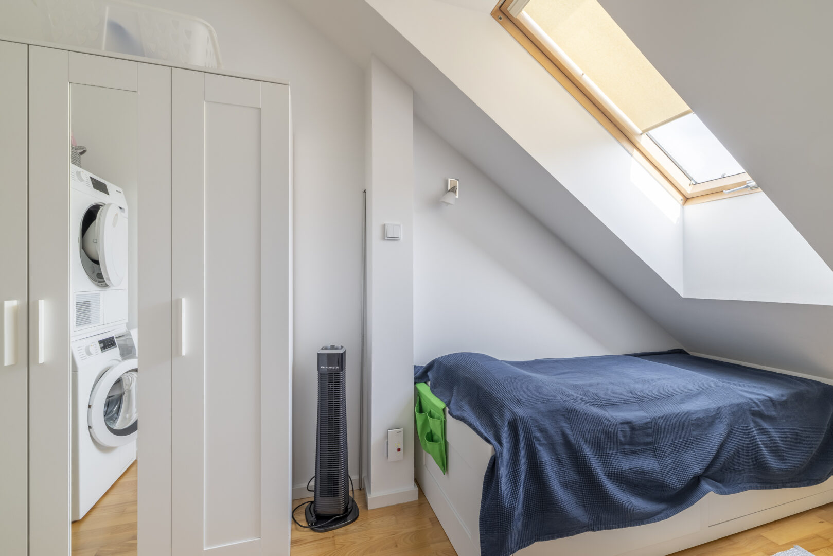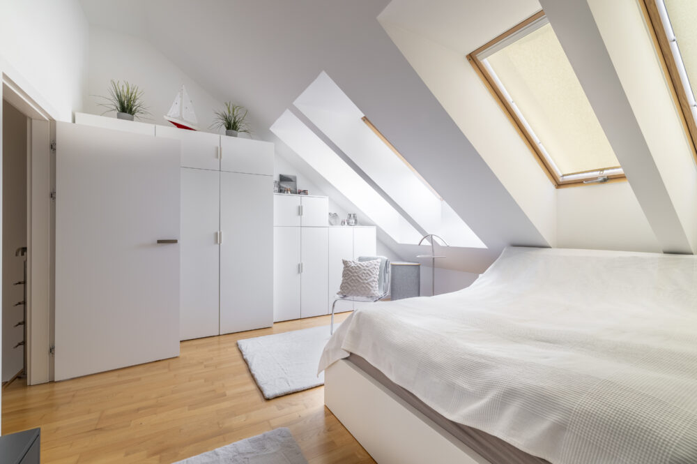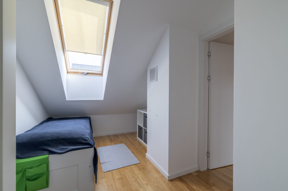 Große Dachflächenfenster bringen außergewöhnlich viel Tageslicht hinein. Hier entsteht eine ruhige, fast loftartige Atmosphäre mit maximaler Privatsphäre.