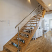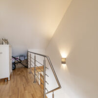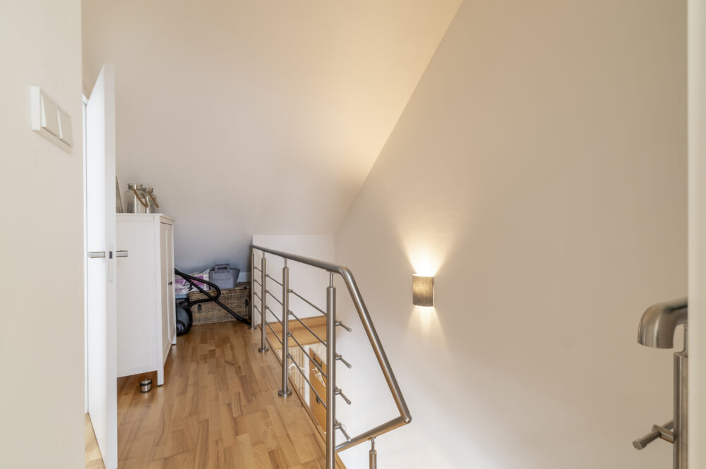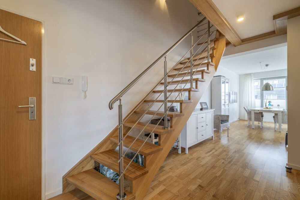 Über die stilvolle Holztreppe erreichen Sie das Dachgeschoss mit zwei Schlafzimmern.