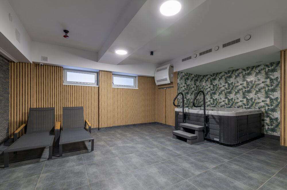 Whirlpool-Bereich mit stilvoller Holz- und Steinoptik. Das ist kein Hotelbetrieb, sondern exklusiv für Eigentümer und Gäste.