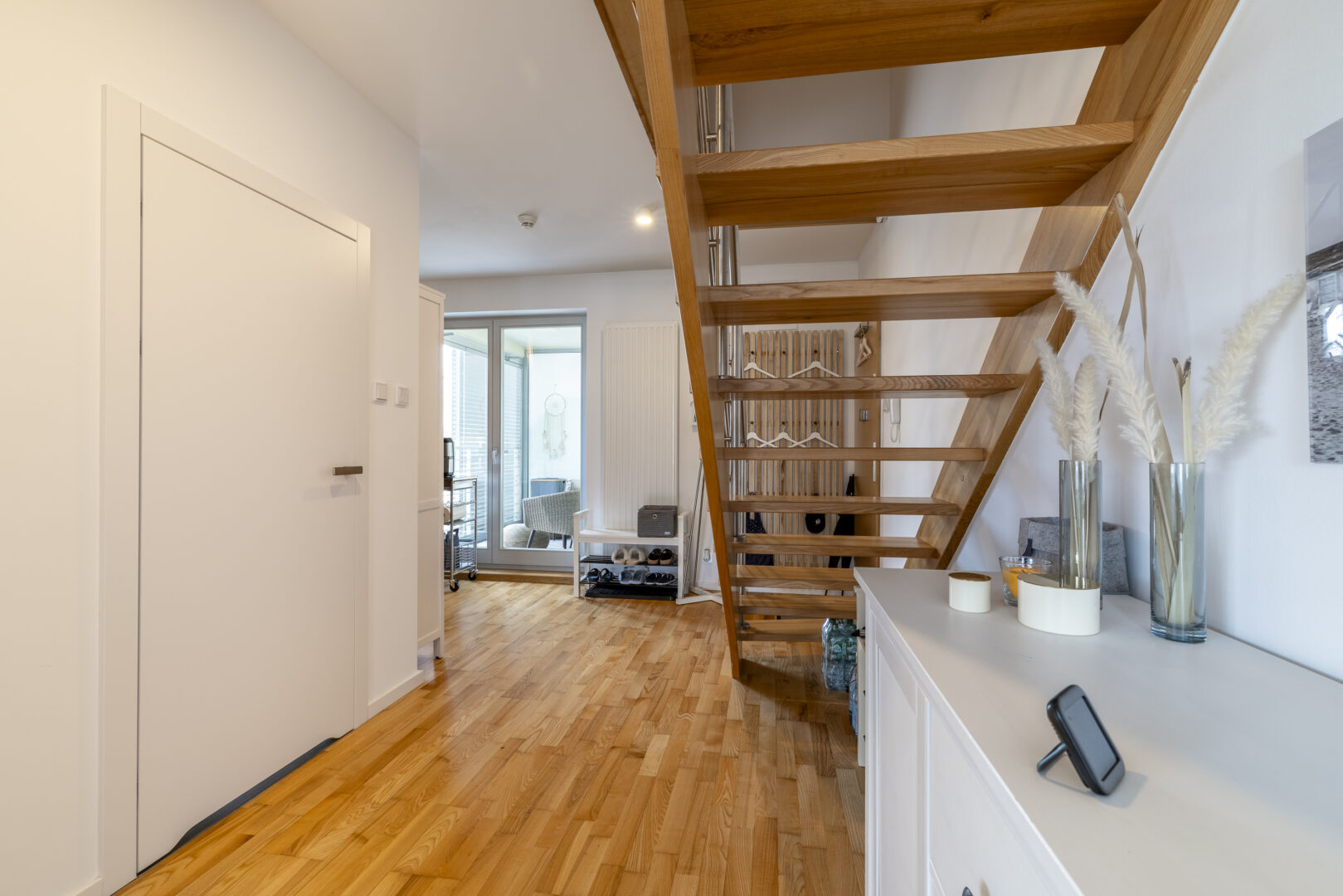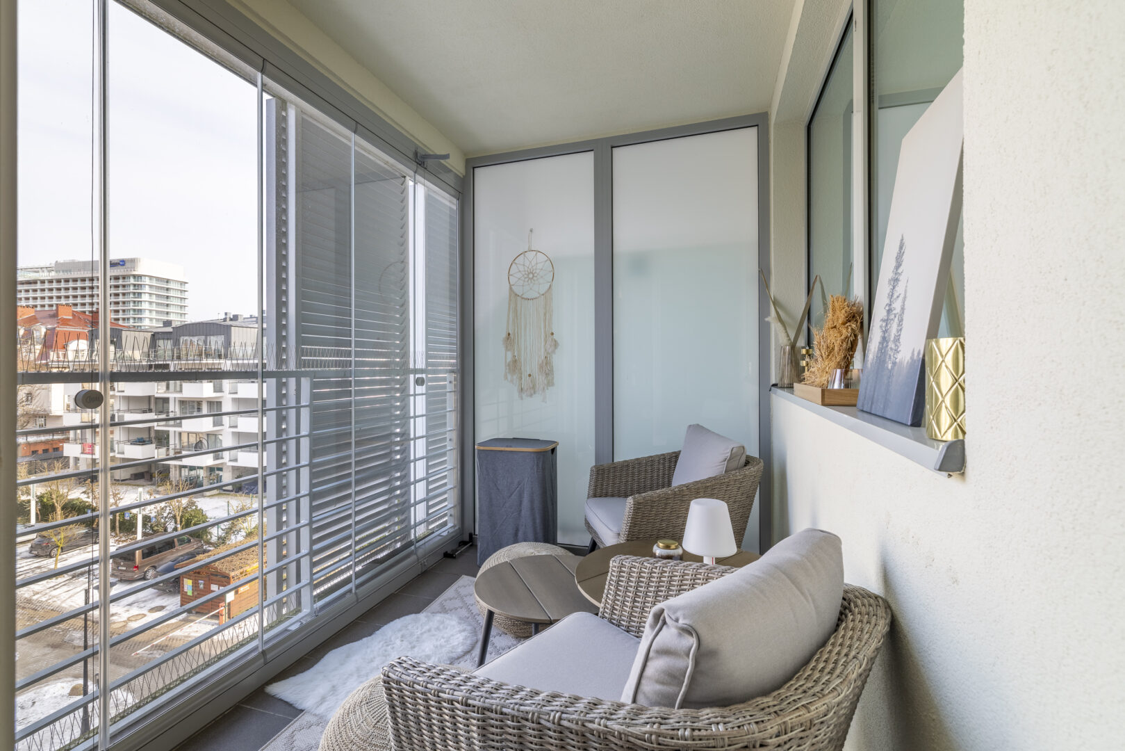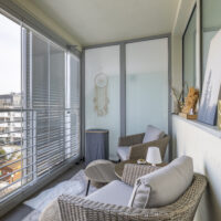 Ein echtes Highlight ist der verglaste Balkon mit Schiebeelementen. Er funktioniert als ganzjähriger Wintergarten. Windgeschützt sitzen, selbst bei kühleren Temperaturen. Ein Rückzugsort mit Lounge-Möbeln, der den Wohnraum optisch erweitert.