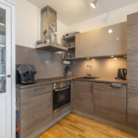 Die Küche ist modern integriert, hochwertig ausgestattet und funktional gestaltet – inklusive Marken-Geräten, viel Stauraum und eleganter Arbeitsfläche.