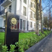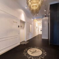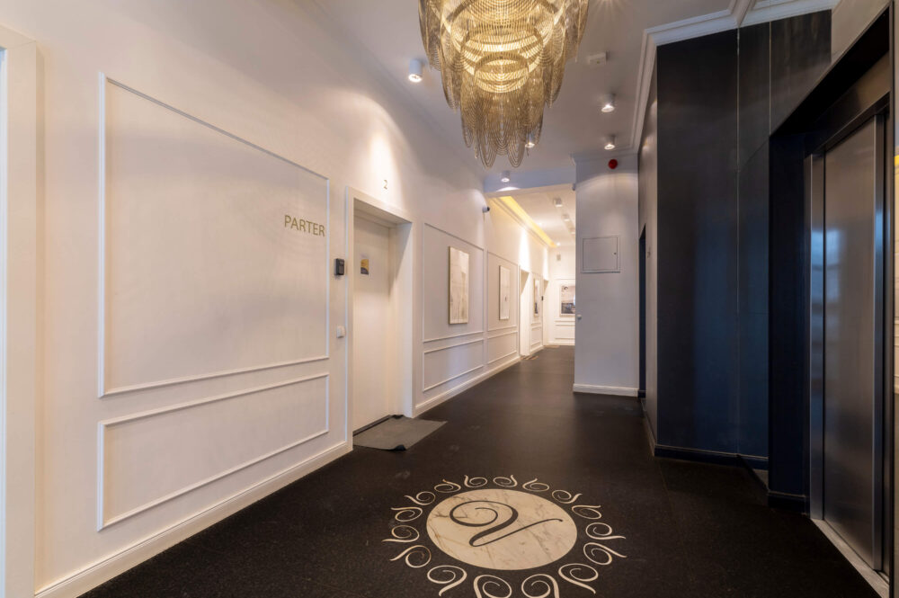 Der Eingangsbereich ist außergewöhnlich repräsentativ gestaltet – mit hochwertigen Natursteinböden, eleganten Wandpaneelen und imposanten Design-Leuchten. Die Gemeinschaftsflächen vermitteln eine stilvolle Boutique-Hotel-Atmosphäre, die sofort Vertrauen und Wertigkeit ausstrahlt.