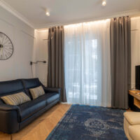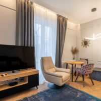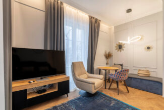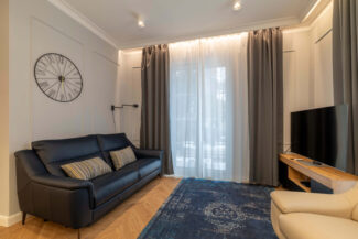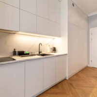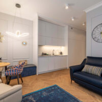 Der Wohn- und Schlafbereich ist optimal strukturiert. Die offene Küchenzeile ist modern integriert und vollständig ausgestattet. Hochwertige Möbel, stilvolle Design-Beleuchtung und Marken-AGD-Geräte sind im Kaufpreis enthalten.