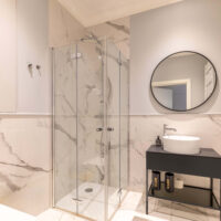Das Badezimmer präsentiert sich im eleganten Marmor-Stil mit bodengleicher Glasdusche, hochwertigen Armaturen und modernem Waschtisch – eine private Wohlfühlzone nach einem Tag am Meer.