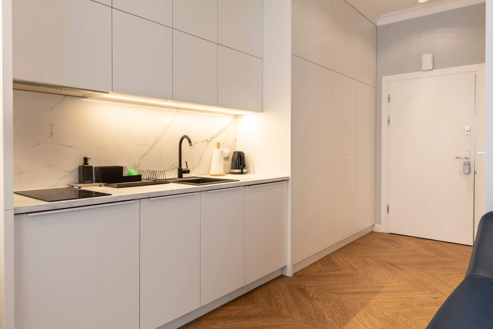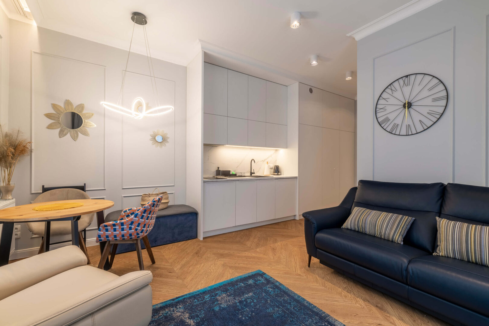 Der Wohn- und Schlafbereich ist optimal strukturiert. Die offene Küchenzeile ist modern integriert und vollständig ausgestattet. Hochwertige Möbel, stilvolle Design-Beleuchtung und Marken-AGD-Geräte sind im Kaufpreis enthalten.